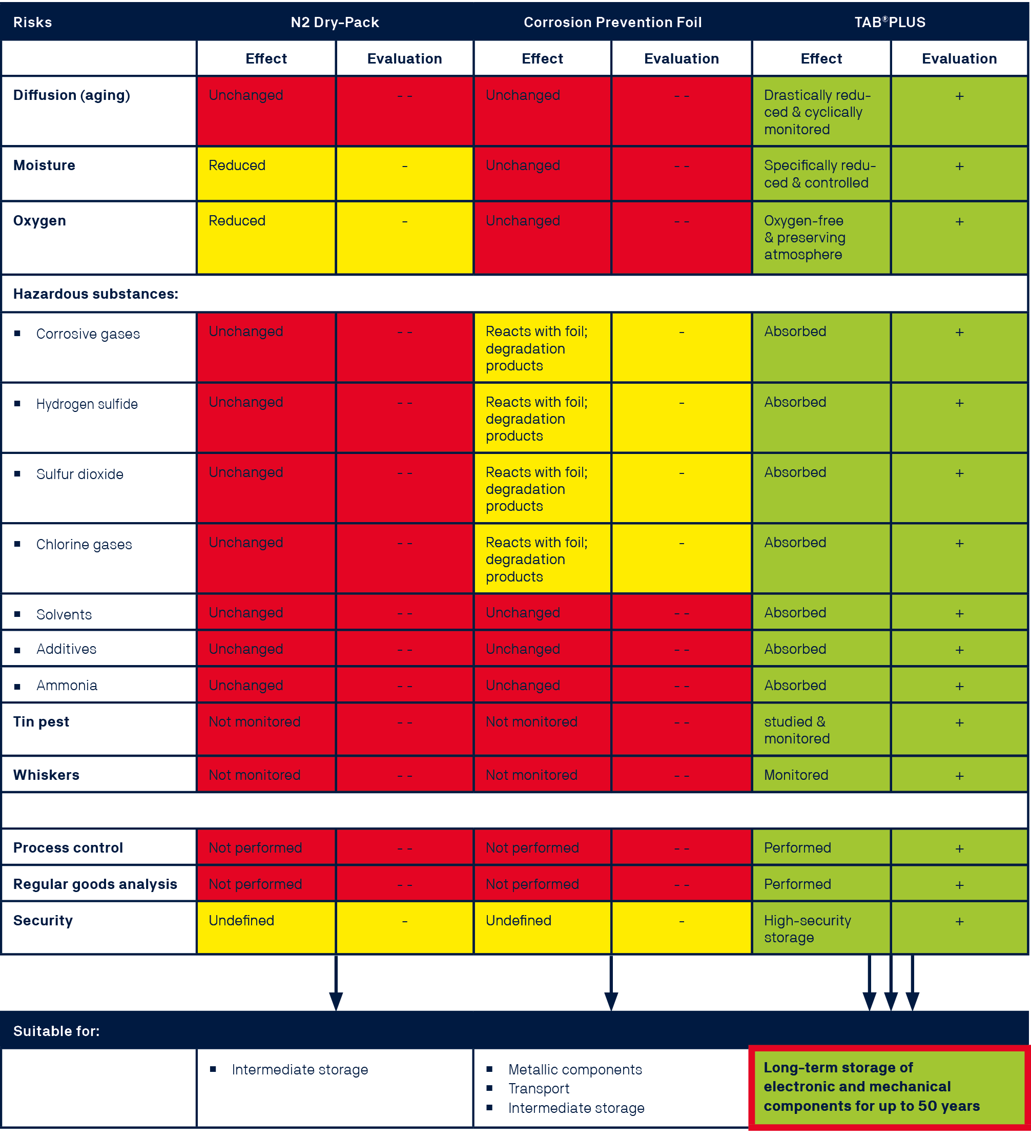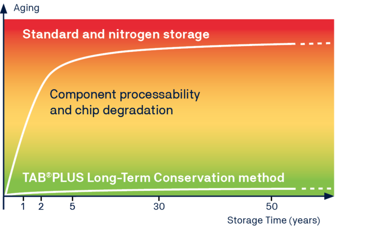 The TAB®PLUS Long-Term process, with decades of proven success and globally unique, enables a significant reduction of critical physical and chemical aging processes in electronic components through special absorbing materials against hazardous substances, a preserving atmosphere and specific storage conditions.
