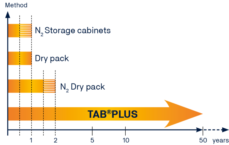 Material changes usually occur most rapidly during the first few years of standardized storage. Components not immediately required should be stored using the TAB®PLUS method as soon as possible to ensure the long-life cycle of the product.