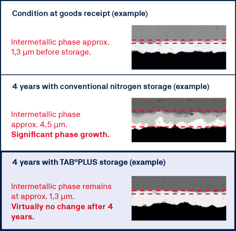 In regular nitrogen storage, the intermetallic phase grows by about 1 μm each year. However, components stored using TAB®PLUS show almost no growth.